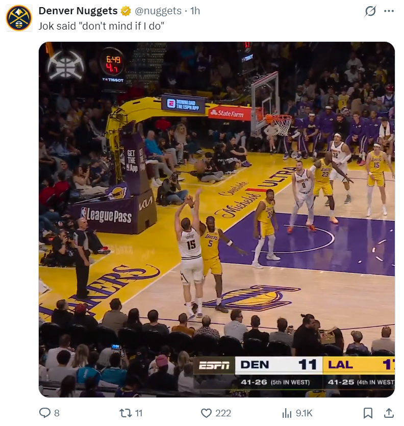 此役尼古拉-约基奇再度碰上德安德烈-艾顿了,一直以来约基奇打艾顿这种偏软的内线都是手拿把掐,首节7中4+三分3中1拿到9分4篮板2助攻1抢断,还迎着艾顿的长臂命中底角三分球。