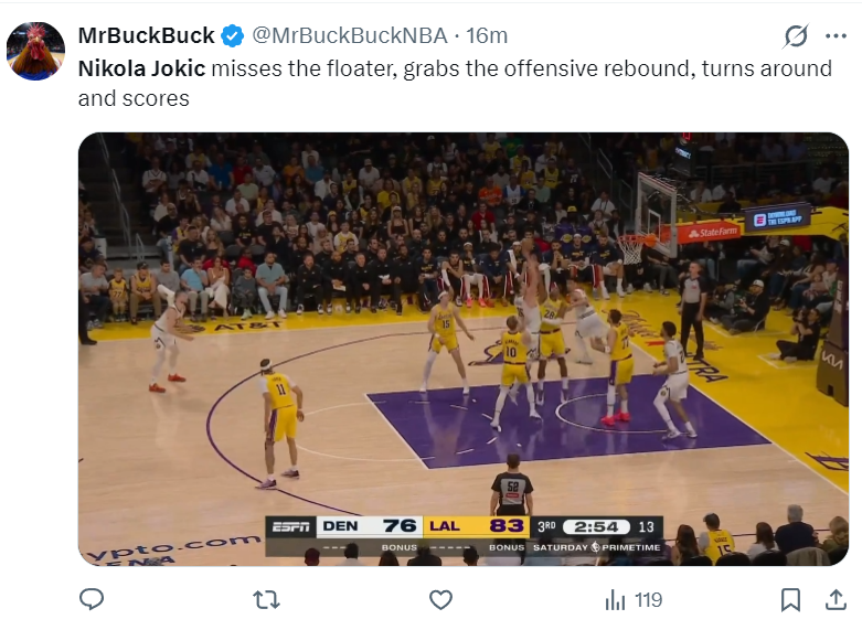 北京时间3月15日,掘金以125-127惜败湖人。此役约基奇罕见的暴扣了,而且他拿到了本赛季第27次三双,也是职业生涯第191次三双,下半场也是依靠约基奇的发挥抹平17分的差距,末节被里夫斯神奇拖入加时赛,而加时赛约基奇被艾顿打爆,最终东契奇准绝杀。