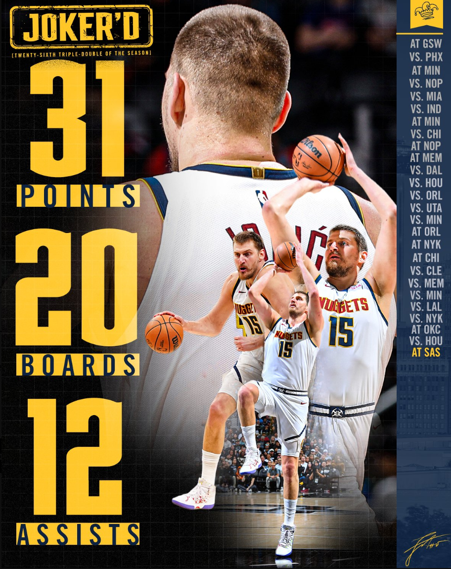 上一场对阵马刺约基奇是31+20+12的三双,此役拿到三双后已经是连续四场比赛三双,末节约基奇休息了3分多钟登场,虽然约老师上来没有得分但送了两个三分助攻直接拉开分差,东契奇连拿6分帮助湖人抹平分差,两队各送失误,决胜时刻里夫斯两罚一中自己拼下前场篮板抛投绝平。