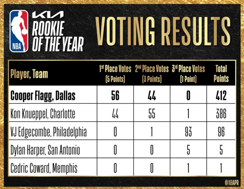 随后,NBA官方公布了最佳新秀投票详情,其中弗拉格获得412分排在第一,黄蜂新秀康-克尼普尔386分第二。